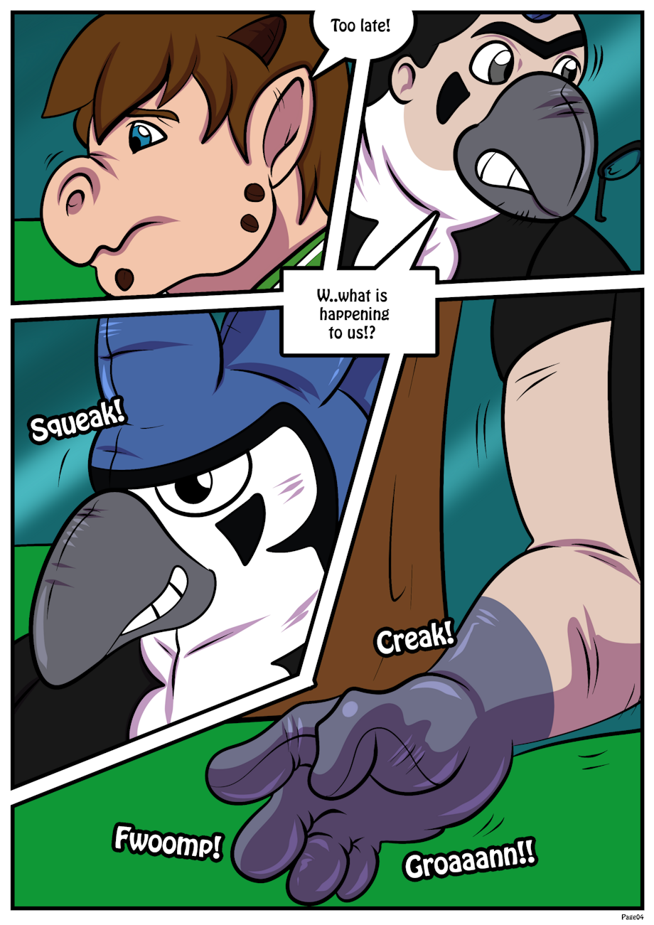 I realized that his warning came too late, as a muzzle and spikes emerged from my own face! Pyro's glasses fell off as the rest of his face changed, white and blue plastic covering it to form the avian head of a blue jay named Hopkins! His chest puffed out, ripping his shirt, and grey plastic covered his hand!