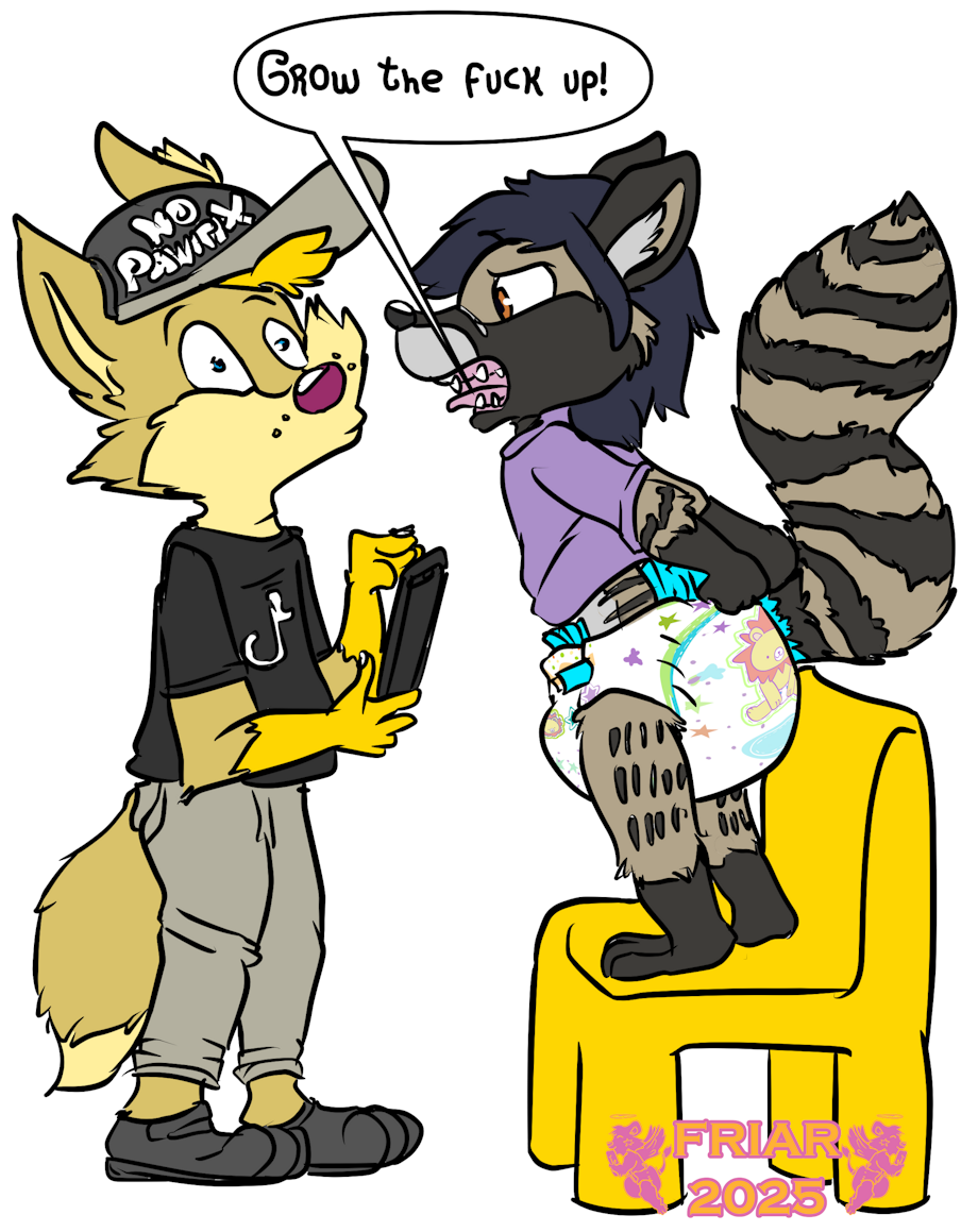 Illustrated commission of Cadence the diapered civet yelling "Grow the fuck up!" at an oblivious canine playing on his phone wearing a "No pawitix," cap.
