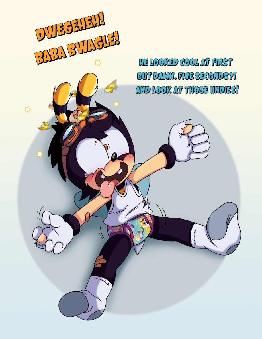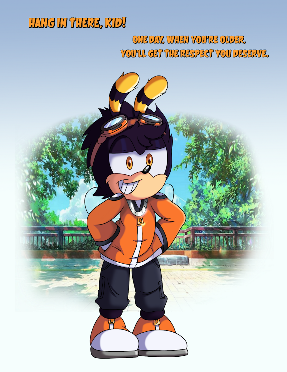 Charmy Bee in his late teens is looking pretty cool isn't he? He stops in the park to give a troubled kid some advice. He even offers to give him some pointers when it comes to fighting. Oh but well... he's still Charmy even after all this time. He can look as cool as he wants. It won't stop him from losing to these kids in a few seconds. Don't worry, he's still a pony fan after all this time.