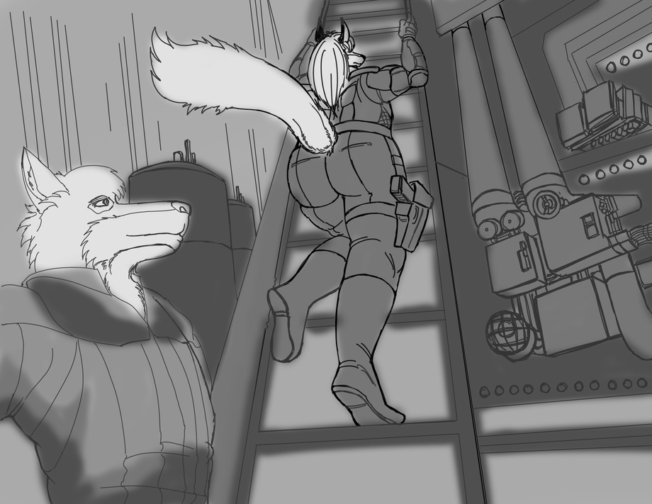 Gistino and Rik are on a stealth mission together and they need to get a clearer view on their target. Spotting a ladder nearby, they decide to ascend it in order to get a vantage point and can assess the area a lot better. Gistino goes first whilst Rik keeps an eye out for any guards until the wolf is high enough to let Rik climb up after him... well OK, it does also give him a chance to get a good vantage point on Gistino's rear quarters. A very good one at that.