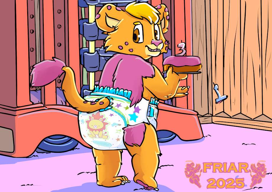 Illustration of Friar the wet and messy diapered and regressed lion toddling in front of his crib holding a small birthday cake with a 3 on the top, looking at the viewer with a smile while he flicks the 1 candle away.
