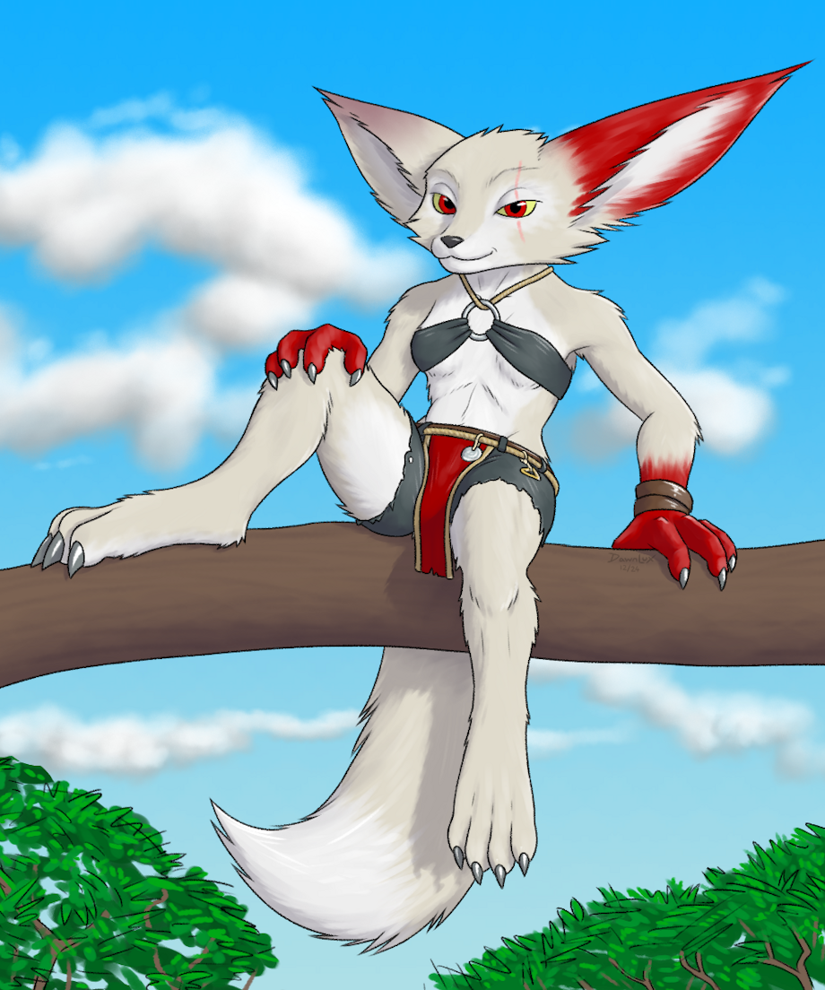 A commission for Cloud McFox, featuring Shaka the tree-climbing vulpera