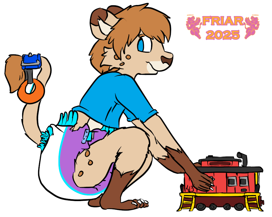 Illustration of Toffee the wet and messy diapered lion crouched over and playing with a Bruno caboose toy.