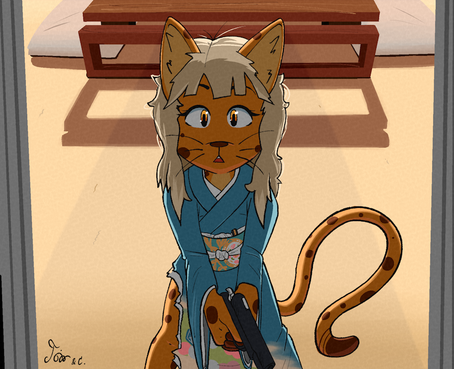 Drew a scene for my cyberpunk campaign. Meet Samira, she's the party's lil gremlin they've spent months rescuing :3