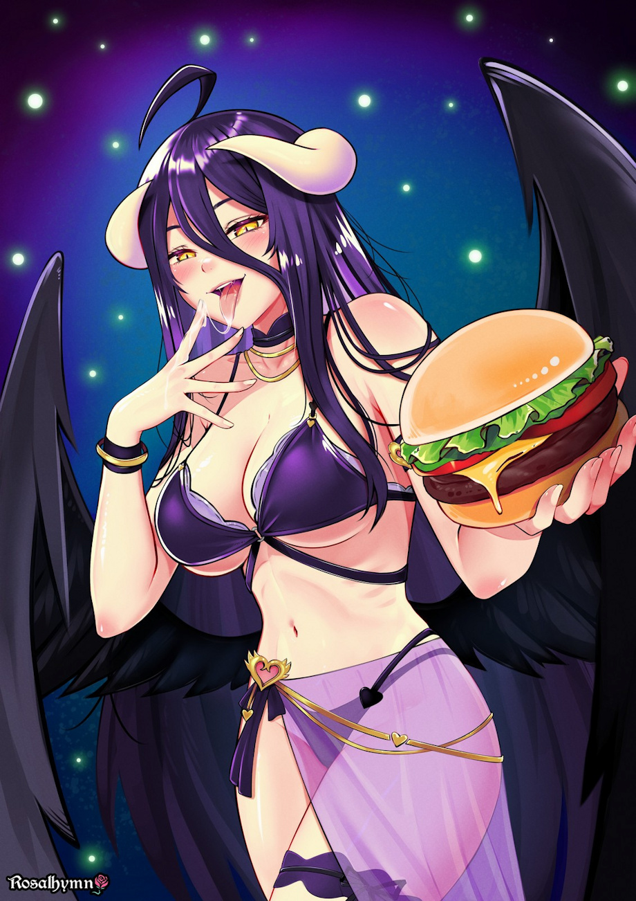 #anime #animegirl #fanart #overlord #hamburger #albedo #art #saliva #licking #lickingfingers #horns #bikini #wings #smiling #longhair #yelloweyes #bigboobs #boobs #tongue #tongueout