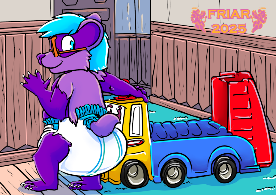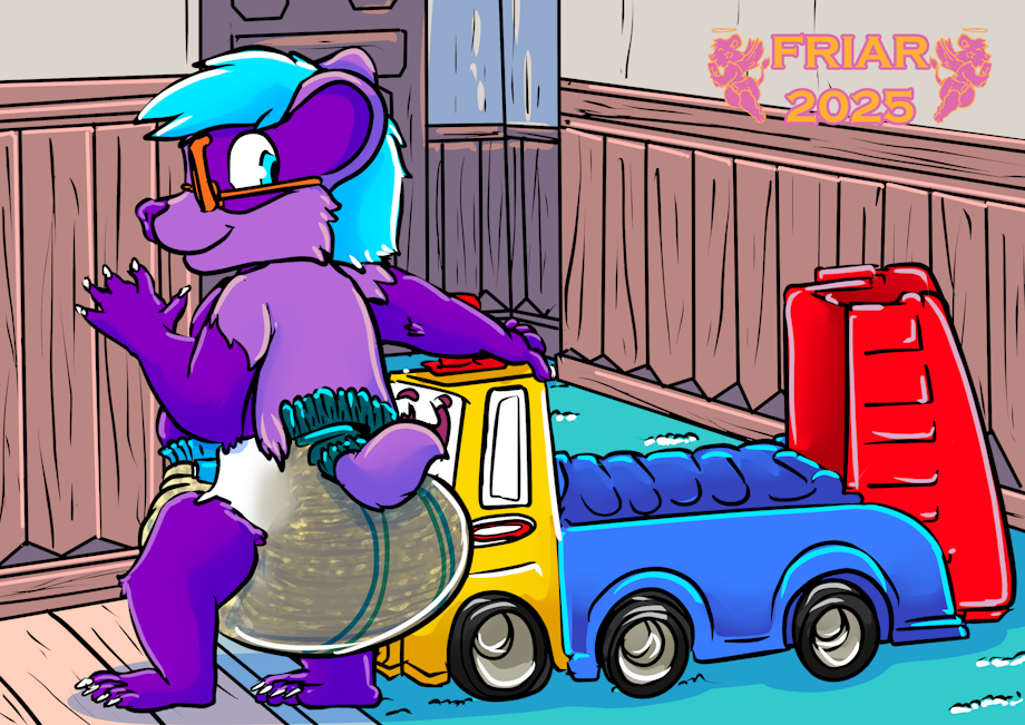 Illustration of Everett the wet and messy diapered badger waving as he holds the front of his riding dump truck toy.