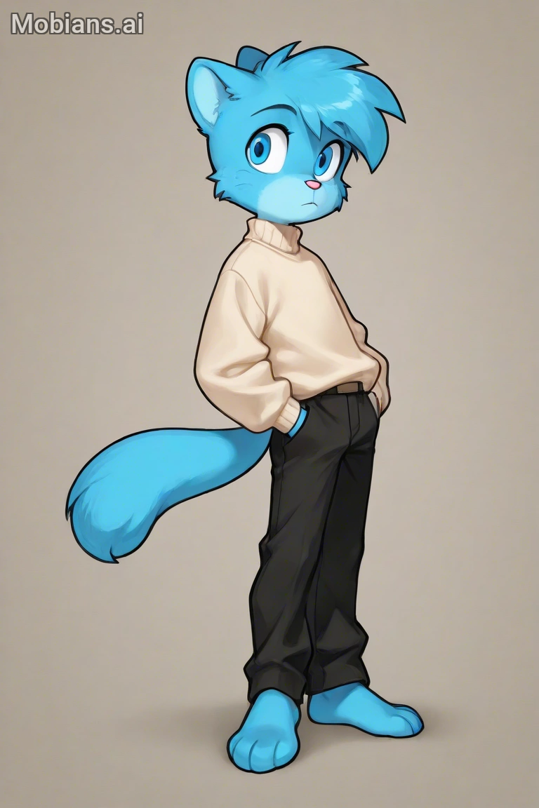 Prompt: Gumball Watterson, Beige Sweater, Black Pants, barefoot, cyan fur, blue eyes,
