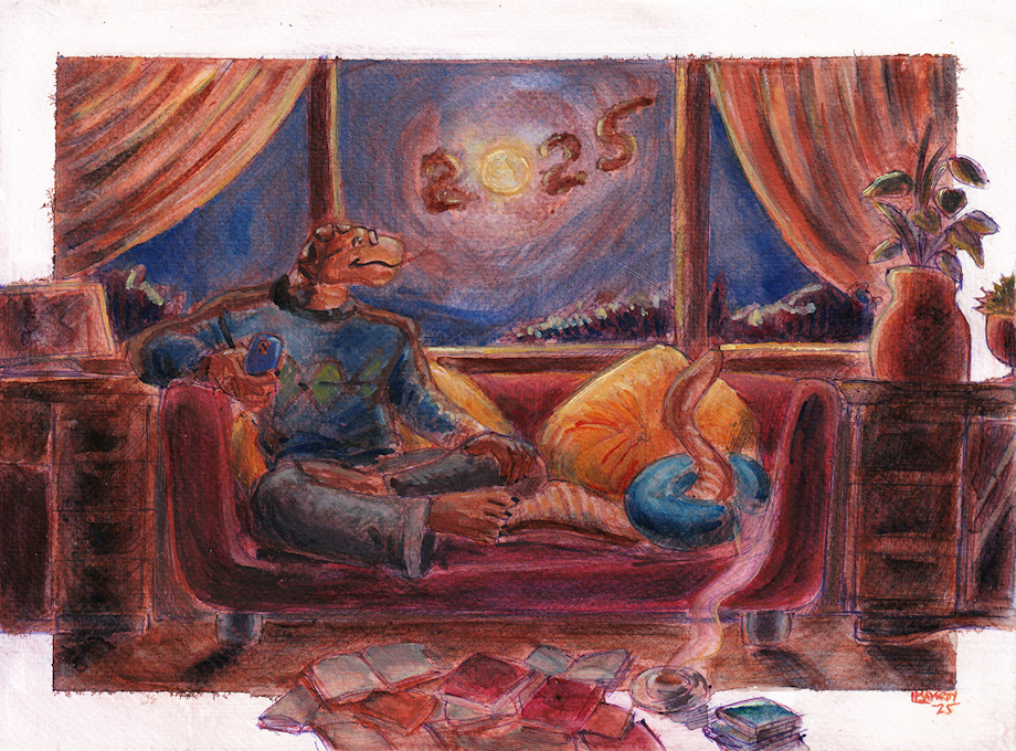 A reticulated python cozying up for the New Year, with coffee and books at his arsenal. Colors echo the warm coffee brown colors for this year, plus an echo of the colors from the first half of the decade.