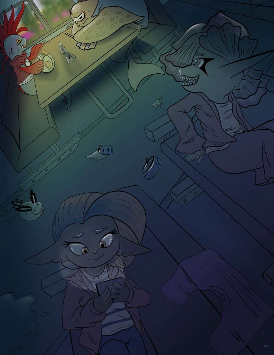 An accompanying piece for the charity zine piece, featuring Tempest Rising getting ready to practice on the road.