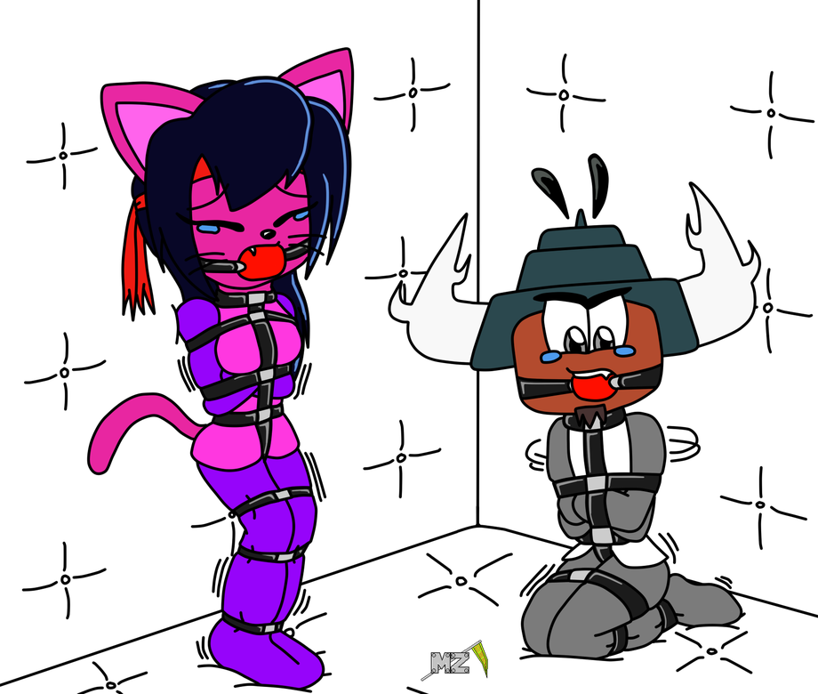 A art-trade for sitinuramjah of Siti and Herman bound in straightjacket in a padded cell.