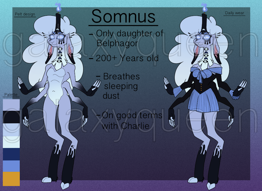 I saw Belphegor’s design in Helluva Boss and my jaw dropped. She is so damn pretty I just had to make her a daughter. She lives in the sloth ring and has her own small clinic she runs within it, and unlike the other clinics there, hers actually offers decent service to its patients. However she only specializes in General Medicine, so her clinic isn’t for emergency or specialized cases. She’s about as old as Charlie give or take a few years and they’re friendly with each other considering the connection between their parents. She doesn’t believe the hotel will work really, but she gives Charlie her support regardless. Also from what I could find there aren’t very many Baphomet demons in the fandom, that or I’m looking in the wrong places, so if this design is similar to anyone else’s I would appreciate being told.