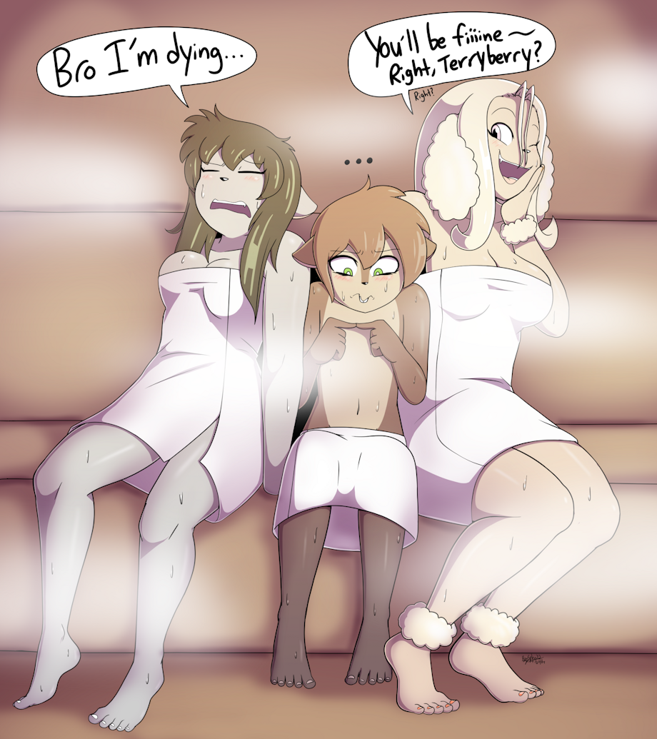 Drawing suggestion from Mr. Blue of my characters Zoe, Mole and Alicia in a sauna. :p