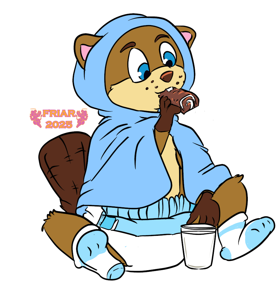 Commissioned illustration of Pax the wet diapered beaver in poncho eating a swiss roll with a glass of milk.