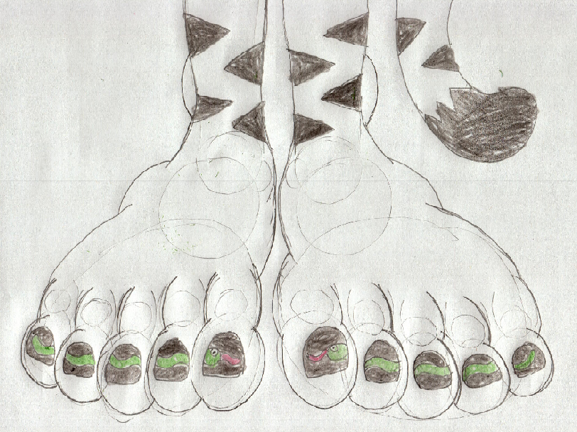 I know this may seem late, but for the Year of the Snake which kicked off not too long ago, I drew my Mobian gal Kyrie the White Tigress' feet with a snake design on her toenails.
