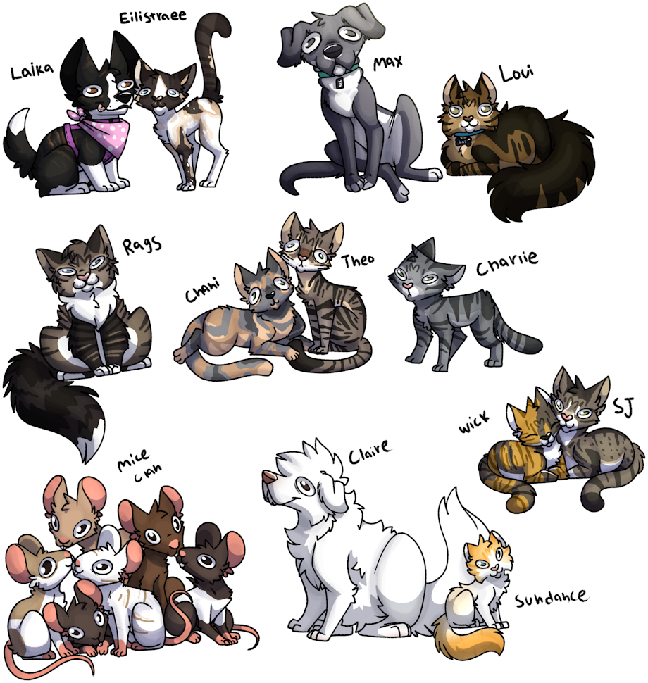 I went on a manic doodling frenzy and drew (most) of the pets of everyone I know. Laika and Eili are my pets, all the others belong to friends or family members. Also all the mice have names, but I don't know any of thew ;w;