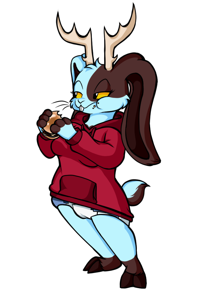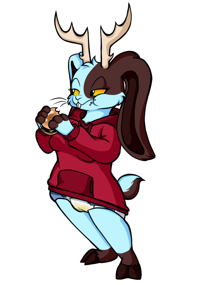 my jackalope oc ive had for a few years now, in all her glory eating a burger in her diapers