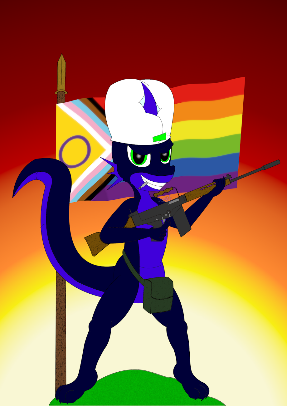 Leon stands on a small green hilltop with an orange sky behind him with a bright yellow light from below. He is clad only in a disposable diaper and holds an FN FAL battle rifle with green synthetic handguard and stock as he looks at the camera with a toothy grin (he also has an FN FAL bullet between his jaws) and a mean look. Behind him is a pro-LGBTQIA flag mounted on a bronze Spartan Spear, flowing in the wind.