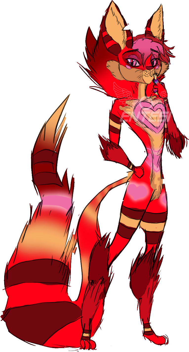 Tall and skinny, covered in red fur with striped of darker red, cream/tan, darker tan, pink and shades of darker red. Their ears are big and long and they have whiskers. On the top of their head is pink and red hair and on the back of their neck up to the back of their head is a fluffy red mane. They have a long fluffy tail. Pink markings glow on their body from their love magic