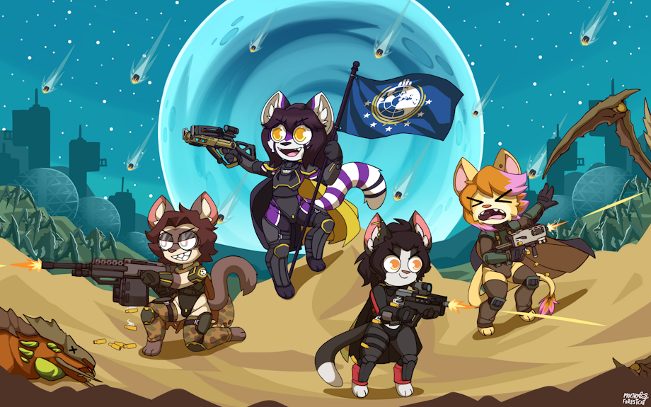 Just four femboys going around spreading Democracy! Of course, Leo is about to get a face full of charger. Made by MOchoForestCat over on X / Twitter and on BlueSky.