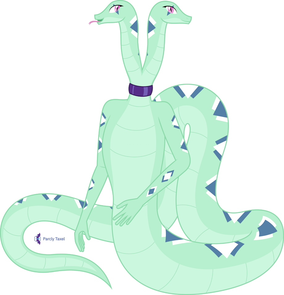 René Taxel is, in their default form, a two-headed nonbinary naga with a mostly mint-green body and pink eyes. The repeating pattern on their back, tail and arms has three overlapping diamonds, each individual diamond alternating between blue and white (so one unit is white-blue-white, the next blue-white-blue, etc.) There is a blue diamond crossing the eyes to continue the pattern.