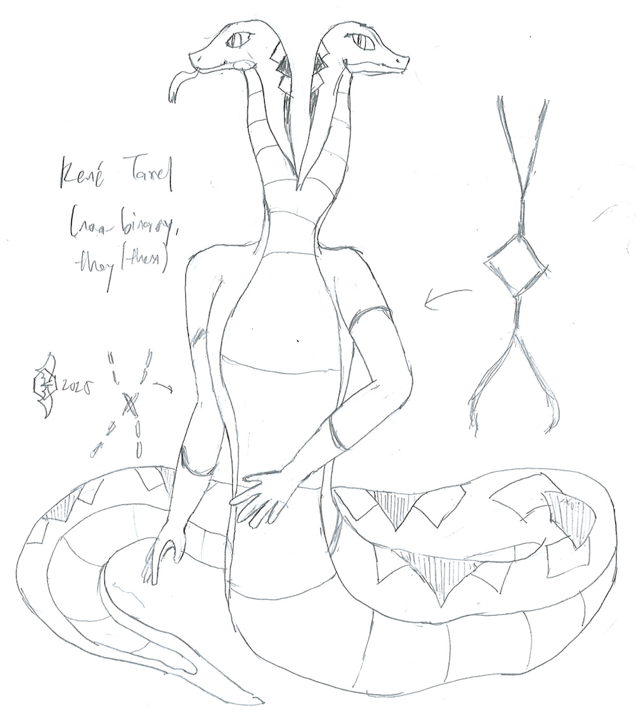 In early 2022, my last semester as an undergraduate at the National University of Singapore, I played board games on most Friday nights at one of its student clubs, and one of them was Betrayal at House on the Hill. One of its scenarios featured a two-headed ever-growing snake as its "traitor" or secret antagonist – the Worm Ouroboros – and having just made Tori Taxel and adopted Hearth I made a note to make another personal character out of it.