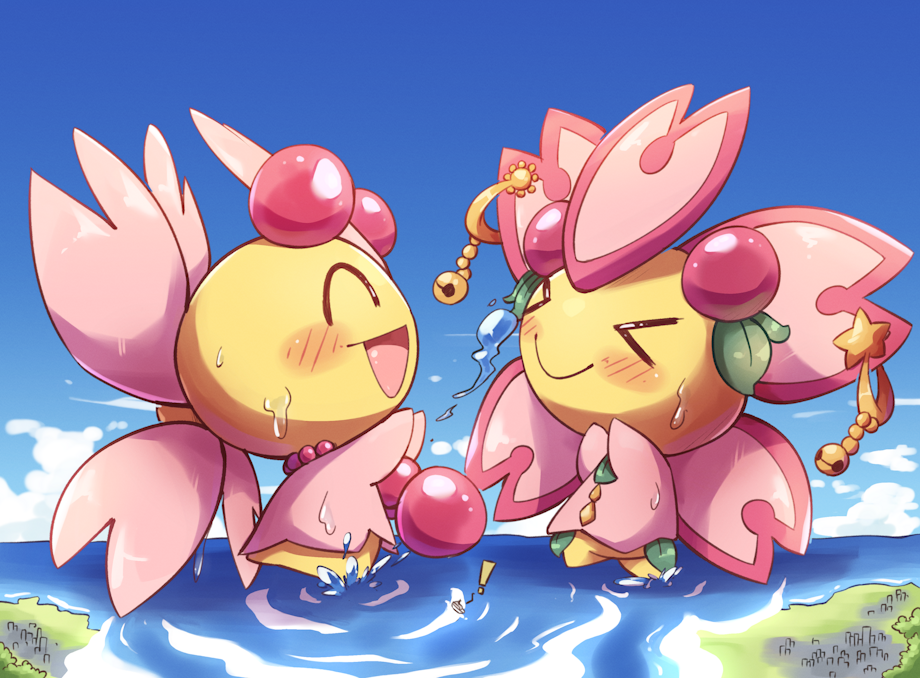 Massive Cherrim playing in water! Splashing each other, capsizing tiny ship, and unawarely causing a tsunami at some city close by~