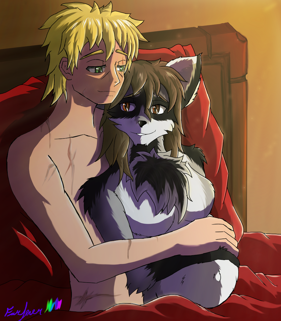 The Captain and his Mate share a private, tender moment as they both await the birth of their first child. And, while the Captain may not be the child's real father (Shiyan and humans can't interbreed) he will certainly protect them as if they were his own. - A commission for A_Loud_Onion