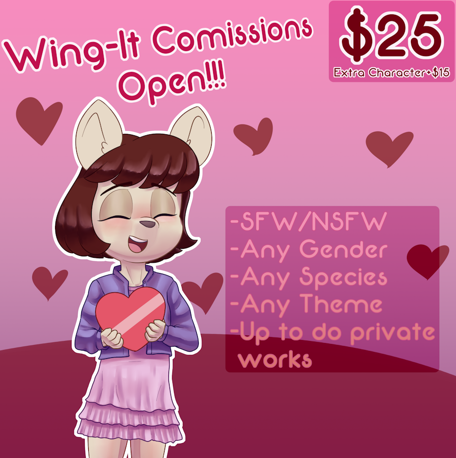 -Wing-it Commissions, no WIP's or changes after started the work, make sure everything is alright before starting the commission