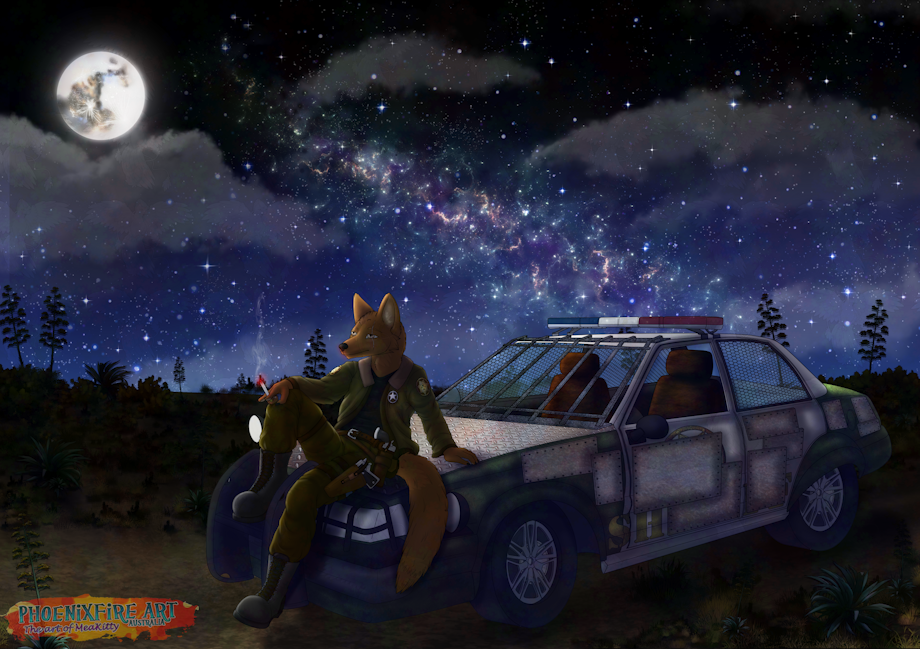 David "Yote" Harlow, 'Sheriff of the Apocalypse', taking a break from a long drive and getting some... uh... fresh air, while he admires the moon and stars in the clear night sky. This is probably the biggest/longest commission I've ever done, I'm not normally one for drawing vehicles but the Crown Vic means a lot to David - his trusty reliable steed in the post-apocalyptic world. Had to get it right, so there was a lot of back and forth on what to include where and how. I'm very proud of it, and I know David loves it already, he's shared it before I could even get around to it. Lol.