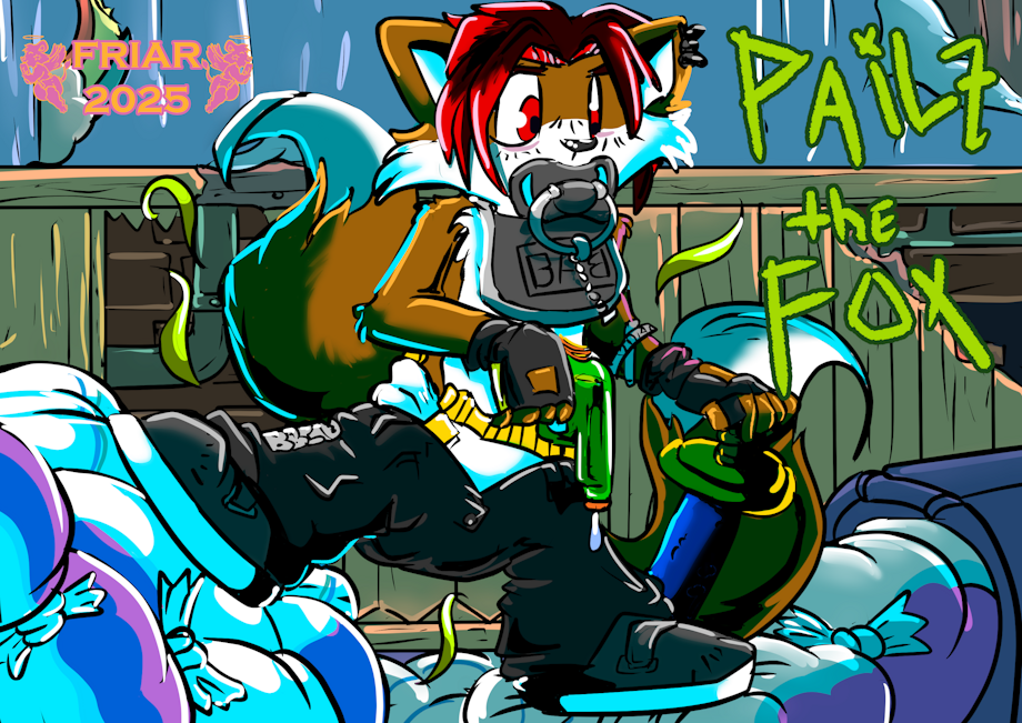 Illustration of a 90s style Tails OC age regressed into wearing wet and messy diapers under cool kid jeans, posing over a pile of spilled over used diapers and a pail in a dilapidated nursery. He also wears a BAB print bib and is sucking a pacifier while wielding a water gun and foam sword.