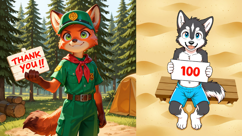 masterpiece, best quality, cub scout nick wilde, young, (cub), child, small body, detailed fur, tuft, anthro, determined <lora:age_slider_v4:-5>, canine tail, smiling, solo,green eyes, detailed eyes, dressed, standing, green hat, red neckerchief, green uniform, short sleeves, belt, camp, Holding two signs, one sign says: Thank you!, the second sign says: "100 Watchers!"