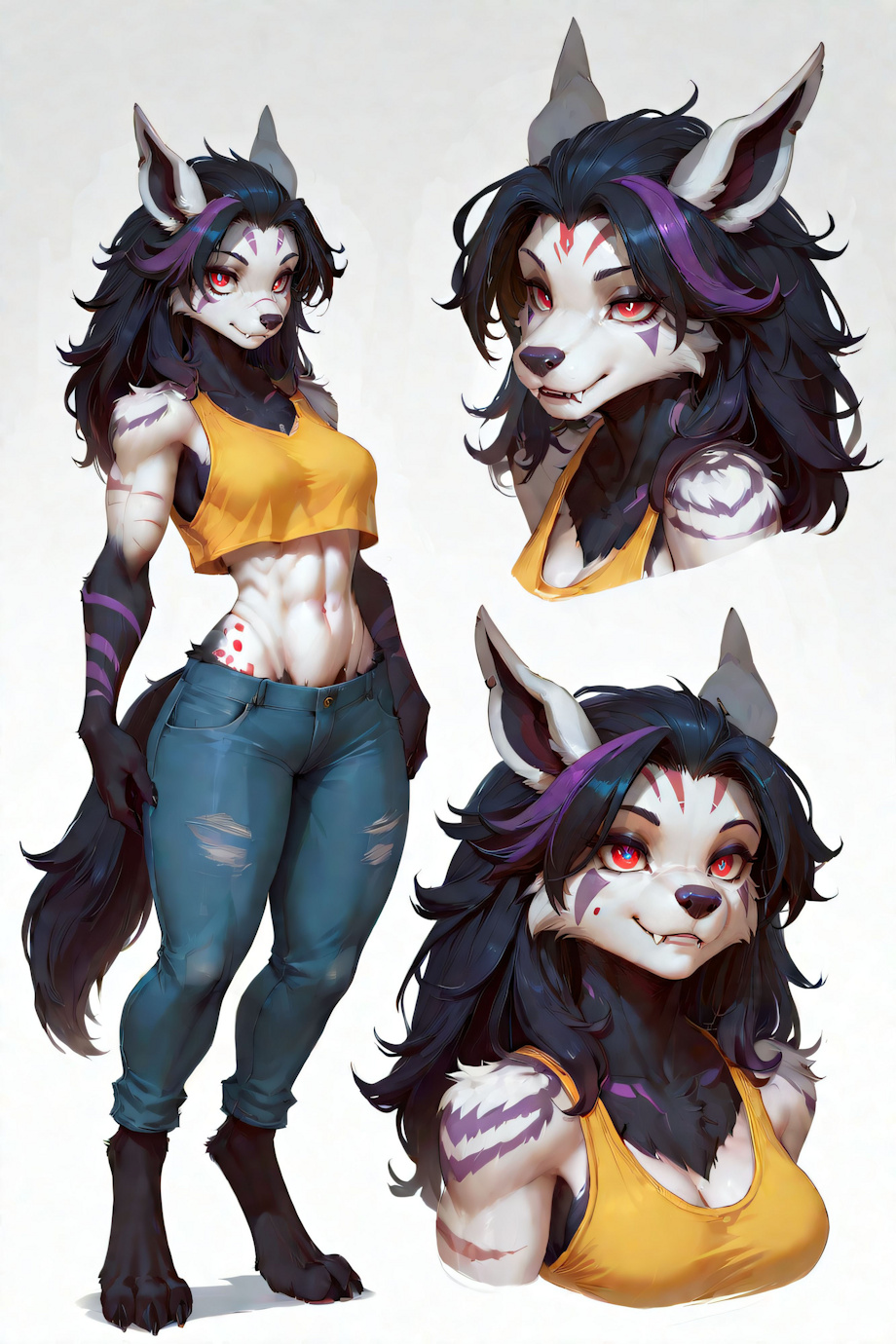 Violet Scales cover the spaces between the hairs that make up her fur, Long Tongue, White Fur, Black Patches of Fur, Digitigrade, Pointed Ears