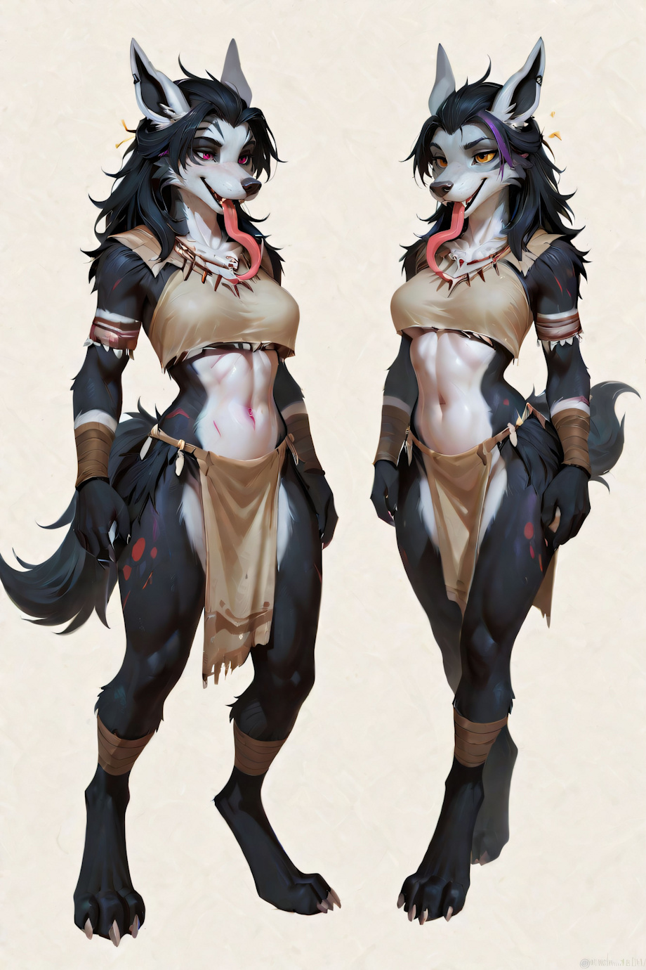 Violet Scales cover the spaces between the hairs that make up her fur, Long Tongue, White Fur, Black Patches of Fur, Digitigrade, Pointed Ears