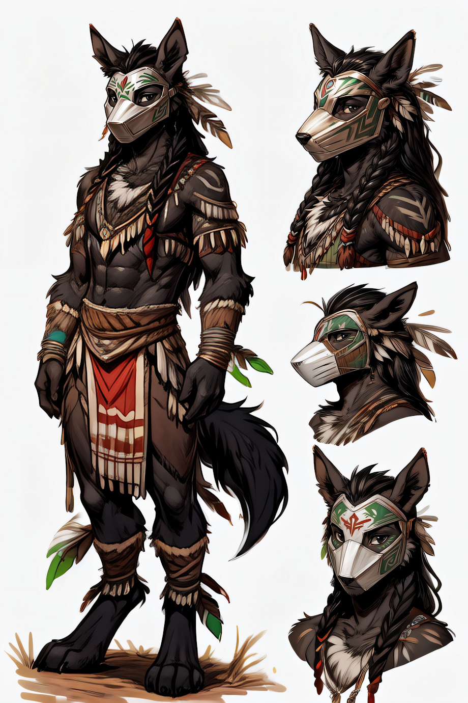 masterpiece, best quality <lora:(1) Furtastic Detailer:1>, <lora:CharacterDesign_Concept:0.6> (CharacterSheet:1), (multiple views, full body, upper body, reference sheet:1), (orange tribal outfit:1.2) BREAK A (female:1.4) (mightyena:1.3) (wild hair, ponytail:braided:1.4) (hair beads:1.2) (side bangs:1.3) (head tuft:1.4) (blue eyes with black pupils:1.2) (circle mark on forehead:1.3) (composite fur (gray fur:1.4) (black belly:1.3)) (digitigrade:1.2) (medium breasts:1.3) (white hair, black highlights:1.4) (big ears:1.3) (full eyelashes:1.4) (black markings:1.3) (tribal markings:1.3) (black mane, chest tuft, chest hair:1.3) (black tail:1.3) (black inner ear:1.3) Negative prompt: bloodshot eyes, arms behind back, hands behind back, blurry, blurry background, bad anatomy, bad hands, three hands, three legs, bad arms, missing legs, missing arms, poorly drawn face, bad face, fused face, cloned face, worst face, three crus, extra crus, fused crus, worst feet, three feet, fused feet, fused thigh, three thigh, fused thigh, extra thigh, worst thigh, missing fingers, extra fingers, ugly fingers, long fingers, horn, realistic photo, extra eyes, huge eyes, 2girl, amputation, disconnected limbs, worst quality, normal quality, low quality, low res, blurry, text, watermark, logo, banner, extra digits, cropped, jpeg artifacts, signature, username, error, sketch ,duplicate, ugly, monochrome, horror, geometry, mutation, disgusting, jpeg artifacts, bad quality, jpg artifacts,badhandv4, easynegative boring_e621_v4, bad quality, worst quality Asian-Less2-Neg Steps: 35, Sampler: DPM++ 2M Karras, CFG scale: 5, Seed: 2193544590, Size: 768x1152, Model hash: 11418ef90f, Model: yiffymix_v43, VAE hash: 24e650297c, VAE: furception_vae_1-0.safetensors, Denoising strength: 0.43, Mask blur: 4, CFG Rescale: 0.7, Resharpen: 0.2, Lora hashes: "(1) Furtastic Detailer: 2e94914f676c, CharacterDesign_Concept: 6f65857a23ad", Version: v1.6.0 postprocessing Postprocess upscale by: 4, Postprocess upscaler: 4xUltrasharp_4xUltrasharpV10.pth extras Postprocess upscale by: 4, Postprocess upscaler: 4xUltrasharp_4xUltrasharpV10.pth |