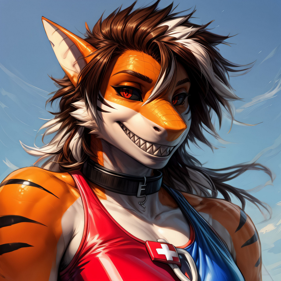 masterpiece, best quality (solo, camisole, yellow bikini:1.4) (smile:1.4) , BREAK <k0nwu1> A female (shark:1.3) (composite scales (orange scales:1.4) (white belly:1.4)) (sharp teeth:1.3) (dorsal fin:1.3) (brown hair:1.3) (white highlights:1.4) (red eyes with black pupils:1.3) (white stripes:1.4) (black sclera:1.5) (black gills:1.3) (orange nose bridge:1.3) (medium breasts:1.1) ( :1.3). Wears (black collar:1.4) <lora:CharacterDesign_Concept:0.6> (CharacterSheet:1), (multiple views, full body, upper body, reference sheet:1) (closeup of sharp teeth:1.5) Negative prompt: bloodshot eyes, arms behind back, hands behind back, blurry, blurry background, bad anatomy, bad hands, three hands, three legs, bad arms, missing legs, missing arms, poorly drawn face, bad face, fused face, cloned face, worst face, three crus, extra crus, fused crus, worst feet, three feet, fused feet, fused thigh, three thigh, fused thigh, extra thigh, worst thigh, missing fingers, extra fingers, ugly fingers, long fingers, horn, realistic photo, extra eyes, huge eyes, 2girl, amputation, disconnected limbs, worst quality, normal quality, low quality, low res, blurry, text, watermark, logo, banner, extra digits, cropped, jpeg artifacts, signature, username, error, sketch ,duplicate, ugly, monochrome, horror, geometry, mutation, disgusting, jpeg artifacts, bad quality, jpg artifacts,badhandv4, easynegative boring_e621_v4, bad quality, worst quality Steps: 35, Sampler: DPM++ 2M SDE Karras, CFG scale: 7, Seed: 3451440895, Size: 1152x768, Model hash: 8e2f4f1346, Model: yiffymix_v44, VAE hash: 24e650297c, VAE: furception_vae_1-0.safetensors, Denoising strength: 0.79, Mask blur: 4, CFG Rescale: 0.54, Resharpen: 0, Lora hashes: "CharacterDesign_Concept: 6f65857a23ad", Version: v1.6.0 postprocessing Postprocess upscale by: 4, Postprocess upscaler: 4xUltrasharp_4xUltrasharpV10.pth extras Postprocess upscale by: 4, Postprocess upscaler: 4xUltrasharp_4xUltrasharpV10.pth |