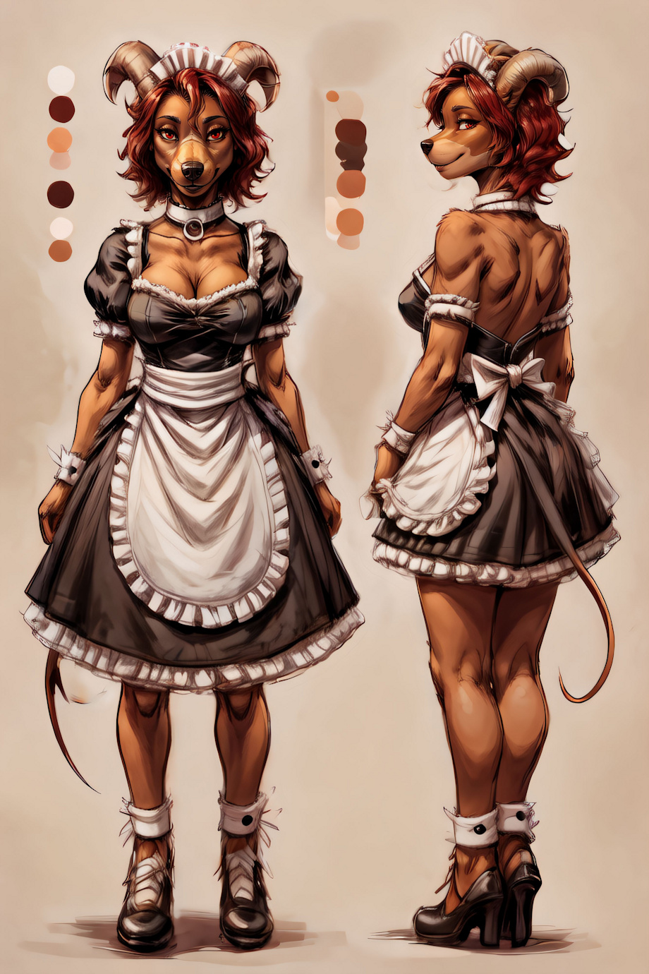 " masterpiece, best quality <lora:(1) Furtastic Detailer:1> (maid uniform:1.4) BREAK <m0rg4nn4> A (mature:1.2) (female:1) (houndoom:1.3) with a (voluptuous:1), (milf body:1.2) , (medium breasts:1) with (black nipples:1), (yellow horns:1), a (forked tail:1) and (red eyes with black pupils:1). She has (short red hair:1.3), and wears a (silver collar:1). GS-Womanly j3nny-001 <lora:bridal_hairstyle:0.8> bridal_hairstyle, <lora:CharacterDesign_Concept:0.6> (CharacterSheet:1), (multiple views, full body, upper body, reference sheet:1),, (clothes:2)