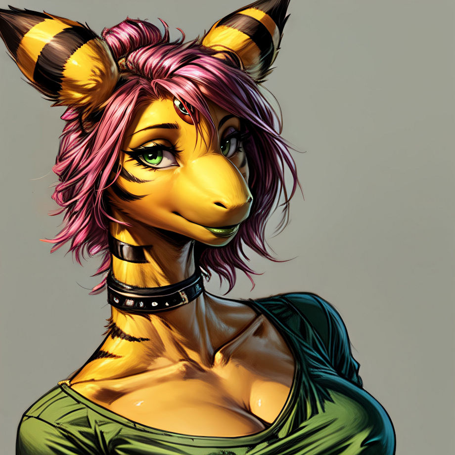 masterpiece, best quality <lora:(1) Furtastic Detailer:1> (green shirt, blue skirt:1.4) BREAK <c4nd7> A (female:1.2) (humanoid:1.3) (ampharos:1.3) [light:neck:1] (slender:1.4) (athletic body:1.3), (yellow fur:1.2) (black stripes:1.4) (medium breasts:1.2), (pink nipples) (pink shoulder tuft:1.2) (green eyes and black pupils:1.2) (short pink hair:1.3) (hair bun:1) (pixie cut:1) (thick thighs:1.2) (digitigrade:1.2) legs. She wears (green lipstick:1) (green eyeshadow:1) (nipple piercings:1) (full eyelashes:1) (black collar:1) , and (dipstick tail:1.3) (tail fluff:1.4) GS-Womanly (adrianalima:1) <lora:CharacterDesign_Concept:0.6> (CharacterSheet:1), (multiple views, full body, upper body, reference sheet:1),, (clothes:2) Negative prompt: bloodshot eyes, arms behind back, hands behind back, blurry, blurry background, bad anatomy, bad hands, three hands, three legs, bad arms, missing legs, missing arms, poorly drawn face, bad face, fused face, cloned face, worst face, three crus, extra crus, fused crus, worst feet, three feet, fused feet, fused thigh, three thigh, fused thigh, extra thigh, worst thigh, missing fingers, extra fingers, ugly fingers, long fingers, horn, realistic photo, extra eyes, huge eyes, 2girl, amputation, disconnected limbs, worst quality, normal quality, low quality, low res, blurry, text, watermark, logo, banner, extra digits, cropped, jpeg artifacts, signature, username, error, sketch ,duplicate, ugly, monochrome, horror, geometry, mutation, disgusting, jpeg artifacts, bad quality, jpg artifacts,badhandv4, easynegative boring_e621_v4, bloodshot eyes, 2 tails,, (nipples, nude, nudity:2) (erect nipples:2) (topless:2) Steps: 35, Sampler: Euler a, CFG scale: 7, Seed: 153208987, Size: 768x1152, Model hash: 8e2f4f1346, Model: yiffymix_v44, VAE hash: 24e650297c, VAE: furception_vae_1-0.safetensors, Denoising strength: 0.73, Mask blur: 6, CFG Rescale: 0.7, Lora hashes: "(1) Furtastic Detailer: 2e94914f676c, CharacterDesign_Concept: 6f65857a23ad", Version: v1.6.0 postprocessing Postprocess upscale by: 4, Postprocess upscaler: 4xUltrasharp_4xUltrasharpV10.pth extras Postprocess upscale by: 4, Postprocess upscaler: 4xUltrasharp_4xUltrasharpV10.pth |