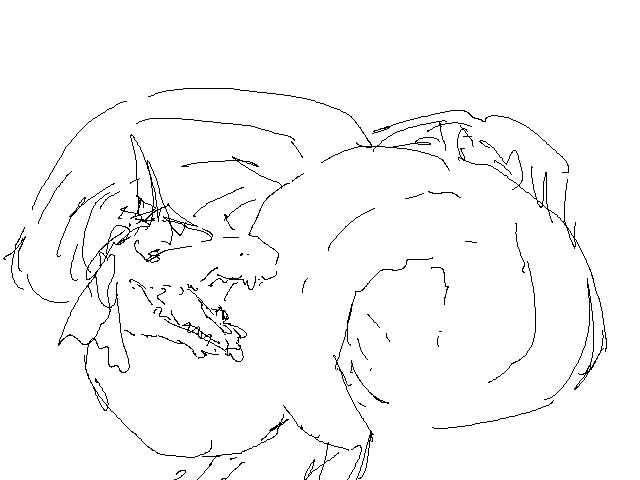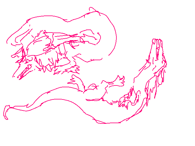 [two drawings of a posey, one where it holds its upper body low to the ground and snarls. another where it writhes on its back grimacing.]