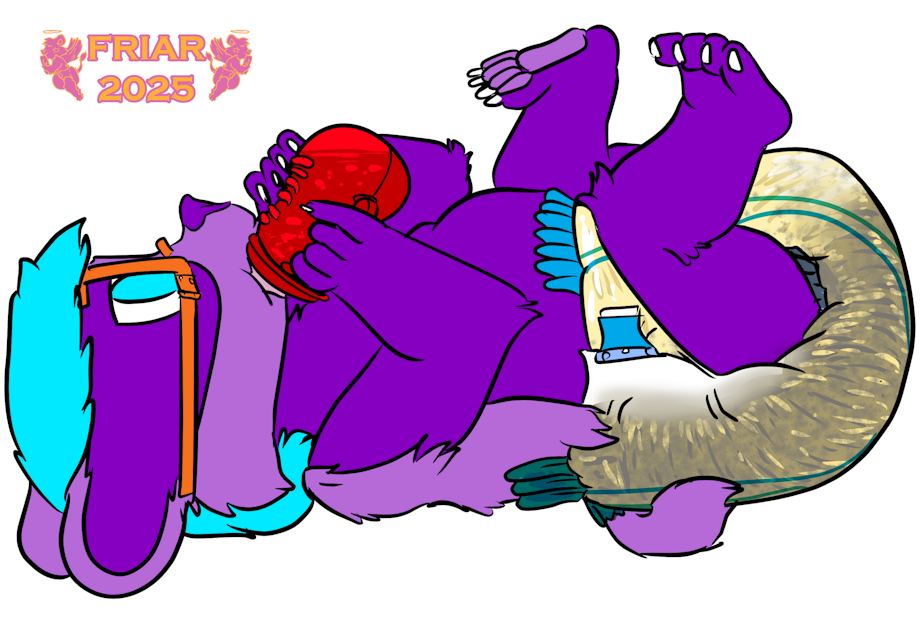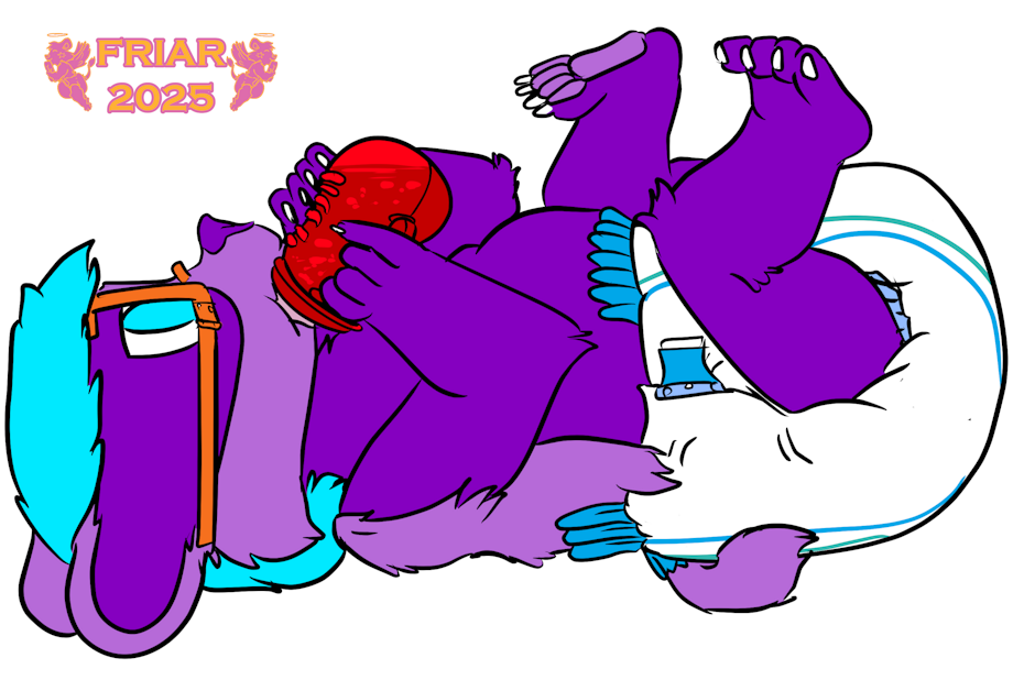 Illustration of Everett the wet and messy diapered badger drinking from a sippy cup while laying on his back in a pretty crib. His snake plushie is visible out of focus in the foreground.