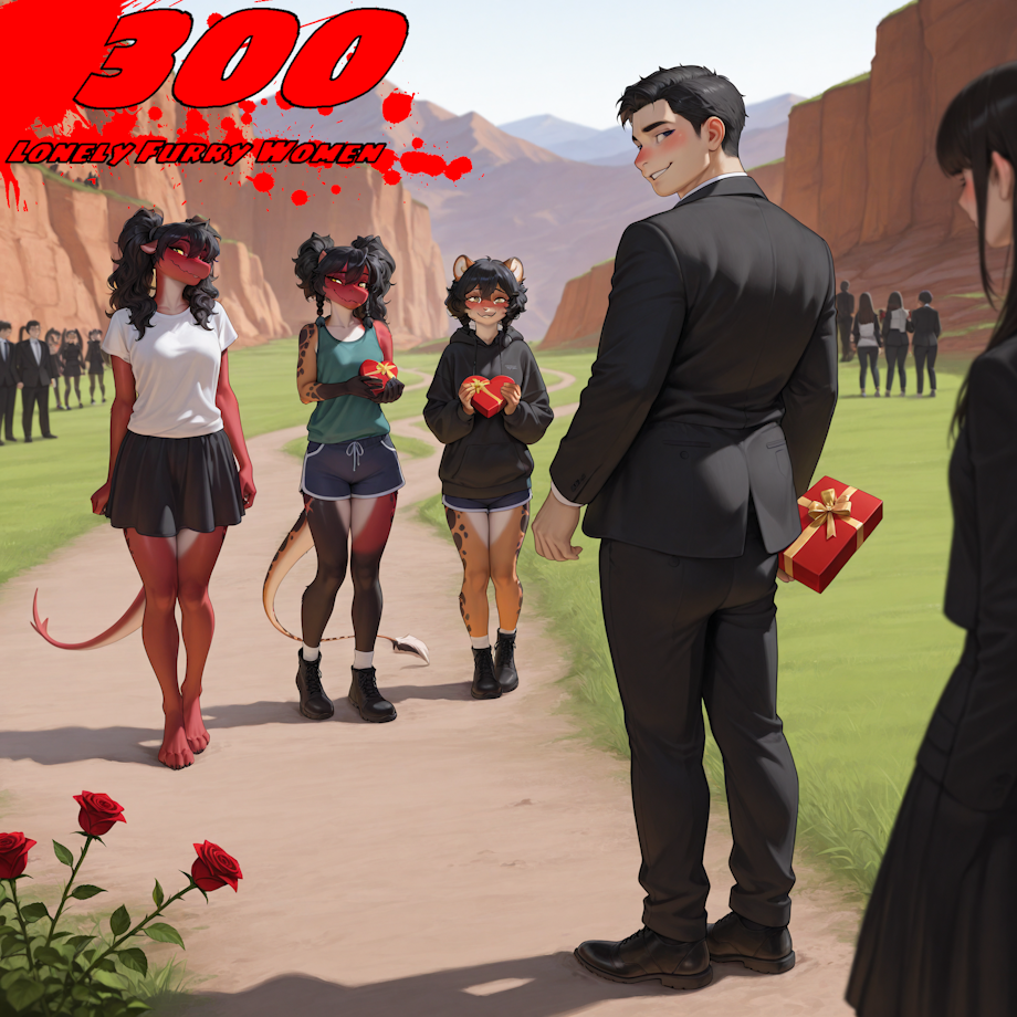 Prompting workflow: Positive Prompt: masterpiece, 8k, volumetric lighting, depth of field, best quality, amazing quality, newest, high detail, clean lines, detailed background, very aesthetic, high resolution, ultra-detailed, absurdres, detailed scenery, score_9, score_9_up, score_8_up, score_7_up, score_6_up, score_5_up, score_4_up, best face, ((detailed eyes)), expressive eyes, good anatomy, best anatomy, best facial details, realistic anatomy, photorealistic details, outdoors, field, grass, mountains, canyon, mountain pass, 1boy, man, adult man, short hair, black hair, fluffy hair, black suit, black suit pants, black shoes, human, facing away, back to viewer, holding roses, holding box of chocolates, standing, posing, BREAK, group, 6+girls, (anthro), ((furry)), [scalie], red body, green body, blue body, brown body, black body, white body, black markings, yellow markings, orange markings, purple markings, long hair, short hair, wavy hair, straight hair, curly hair, fluffy hair, ponytail, bangs, braids, pigtails, twintails, clothed, fully clothed, tanktop, t-shirt, polo, hoodie, skirt, dress, bluejeans, shorts, sweatpants, shoes, sandals, boots, socks, barefoot, bare paws, (aroused), (horny), face blush, nose blush, blushing, naughty face, smirk, shy, embarrassed, wavy mouth, eye contact, facing viewer, looking at viewer, dynamic shot, posing, background characters, background crowd, background furries, background anthros, background scalies, Prompt: A lone human man stands in the lower left corner of the image, facing off against a horde of female anthros, furries and scalies. He is armed only with a single rose and a box of chocolates that he is holding like a shield. The females are all ravenously horny for our male protagonist. Negative Prompt: multiple tails, modern, recent, old, oldest, graphic, bad-artist, bad-artist-anime, EasyNegative, EasynegativeV2, bad-hands-5, badhandv4, verybadimagenegative_v1.3, ng_deepnegative_v1_75t, bad_prompt_version2, BadDreamFastNegativeV2, UnrealisticDream, CyberRealistic_Negative, Asian-Less-Neg, negative_hand-neg, bad_pictures, bad-picture-chill-75v, 16-token-negative-deliberate-neg, nixeu_basic2, nixeu_basic, nixeu_extra, nixeu_soft, nixeu_white, verybadimagenegative_v1.3, wangdihe, text, logo, watermark, speech bubbles, signature, artist signature, cartoon, painting, crayon, graphite, abstract, glitch, deformed, mutated, ugly, disfigured, long body, lowres, bad anatomy, bad hands, missing fingers, extra digit, fewer digits, very displeasing, worst quality, bad quality, bad anatomy, sketch, simple background, conjoined, ai-generated, Size 1024x1024 Model Nova Furry XL 4.0 Steps 25 Sampler Euler a KSampler euler_ancestral Schedule normal CFG scale 5 Guidance 3.5 VAE Automatic Denoising strength 0.4 Clip skip 2 Hires resize 1024x1024 Hires steps 10 Hires upscaler R_ESRGAN 4x I then took the image into GIMP to add the text. |