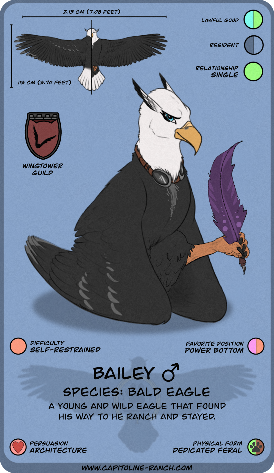 Here is Bailey, a very handsome and self-restrained bald eagle. This is one of the first characters I created. Probably more then 10 years ago. Now you can find him on the Ranch!