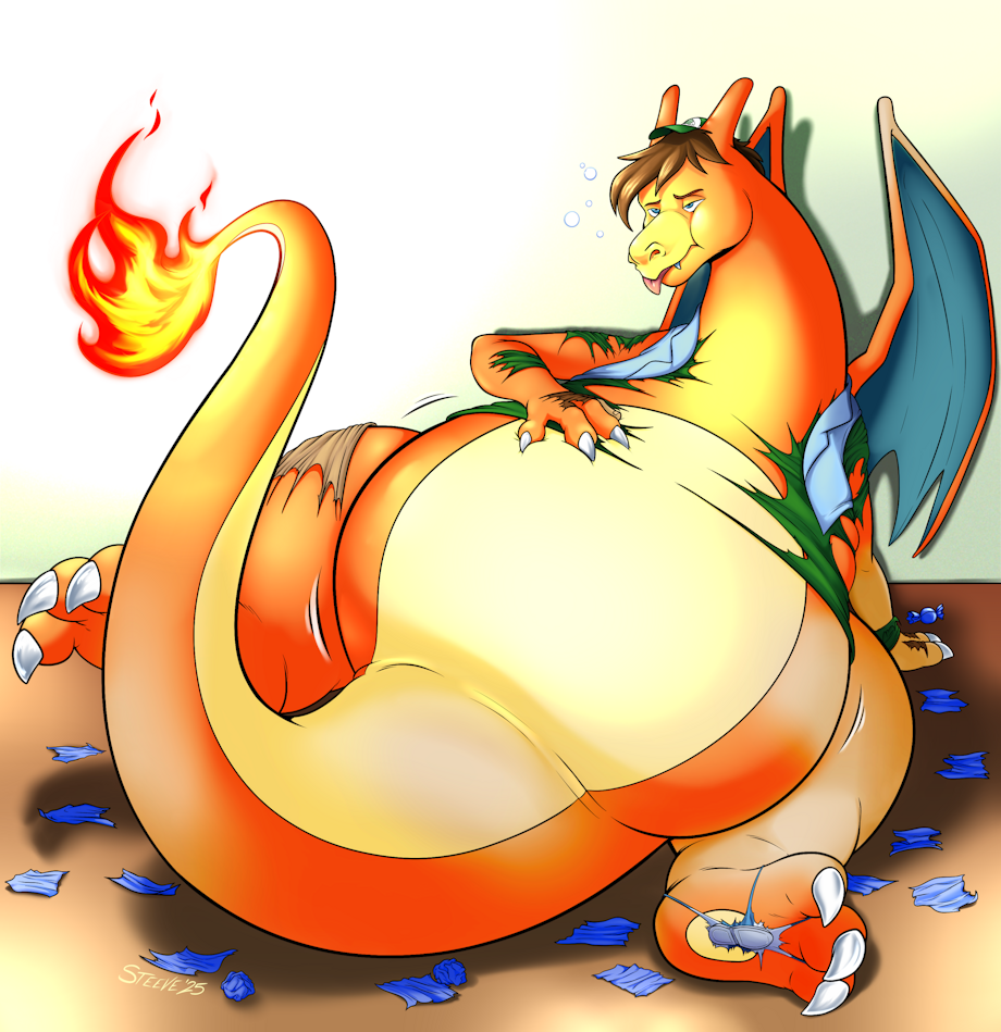 Pheagle learned not to pig out on Rare Candies the hard way! He soon found himself bloating, and fell on his back as a giant Charizard belly tore through his shirt, and talons broke free from his shoes! He was now a fat Charizard, but more importantly he needed to find a PokeCenter for some antacids before he could even think about battling anymon!