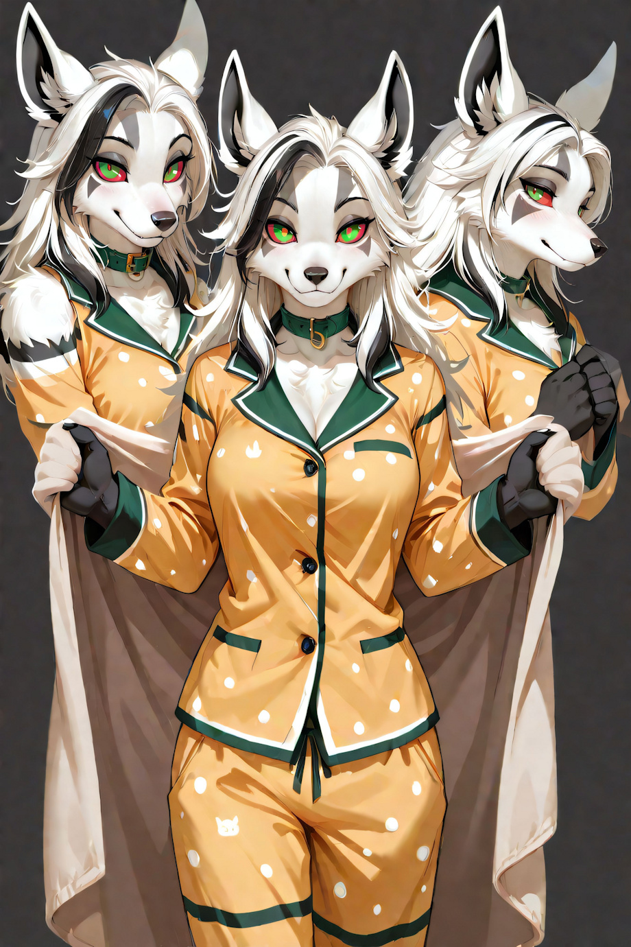 Medium breasts, Slender Athletic Build, White fur with black stripes, bushy black tail, digitigrade legs, she often is seen with a crest on her forehead but doesn't have a naturally forming crest - she paints one onto her fur