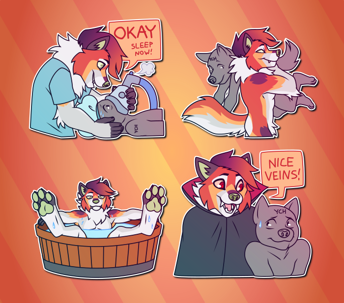 [A collection of Telegram stickers of an anthro fox/wolf hybrid. In them, he holds an anesthesia mask to another character's face and says 'Okay, sleep now!'; carries another character over his shoulder while making a mischievous expression; relaxes in a small wooden tub of water looking smug, with his feet hanging over the edge of the tub; and says 'nice veins!' to another character while looming over them and appearing very vampire-like.]