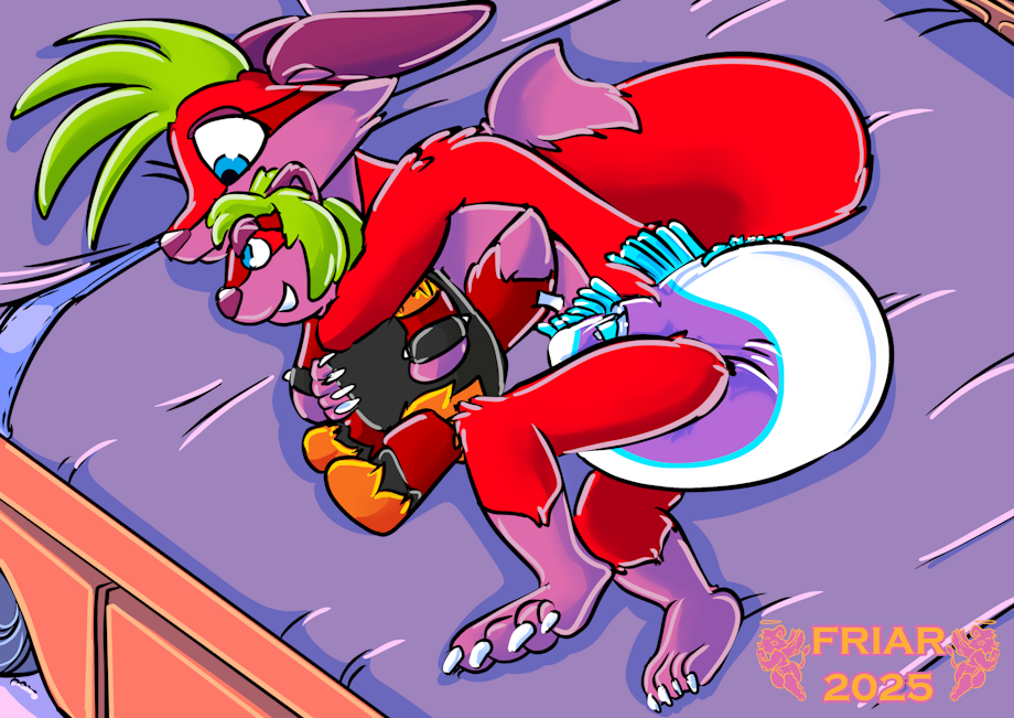 Illustration of Berry the wet and messy diapered fox curled up on his bed cuddling a plushie of his dad, the wrestler Wyldfyre in his flame print getup.