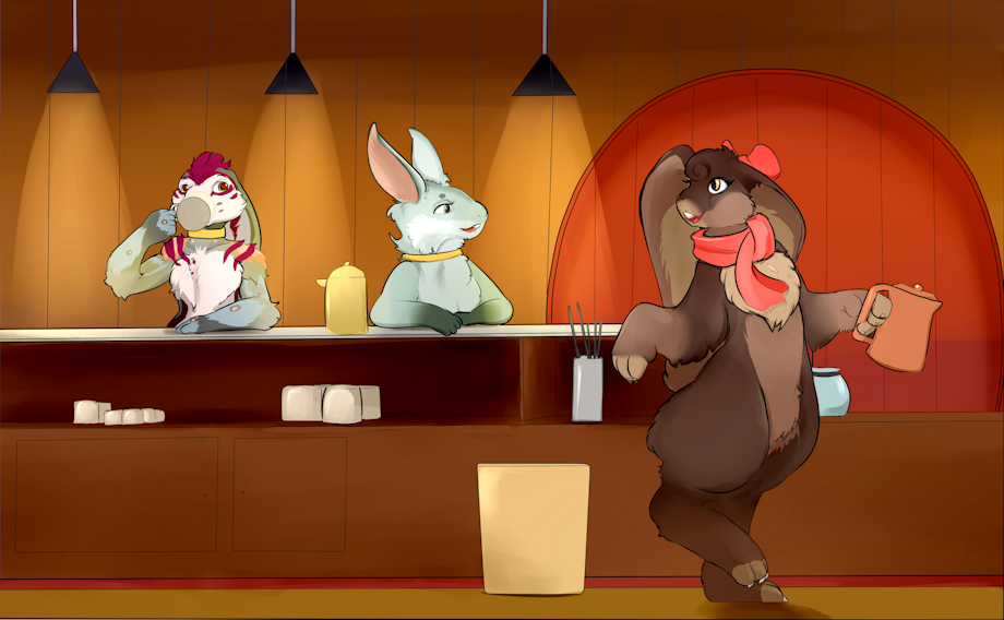 Cafe Mocha run by Mocha bun herself. She's having a conversation with her female mate, Xae, while their shared male mate, Tigerlilly, enjoys some coffee. All three of them are umosu, uplifted rabbits and hares. Umosu often form polycules and they share a mental connection after a bonding ritual and becoming mates. Each umosu has three names, their full name, a short name, and their collective name. Xaeleth or Xae, but all of them are Xaelimoc. Some umosu prefer their short name over their full name, but they all accept being called by their bonded collective name. Xae prefers her short name while Mocha and Tigerlilly prefer like their full names. Tigerlilly doesn't mind Tiger or Lilly.