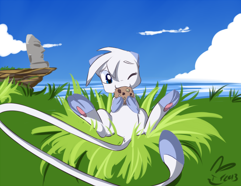 For my first stream pic I did a nice fun picture of Sarien the Mew eating a chocolate chip and macodamian nut cookie, on top of a ledge overlooking the ocean with a Easter Island head in the distance.
