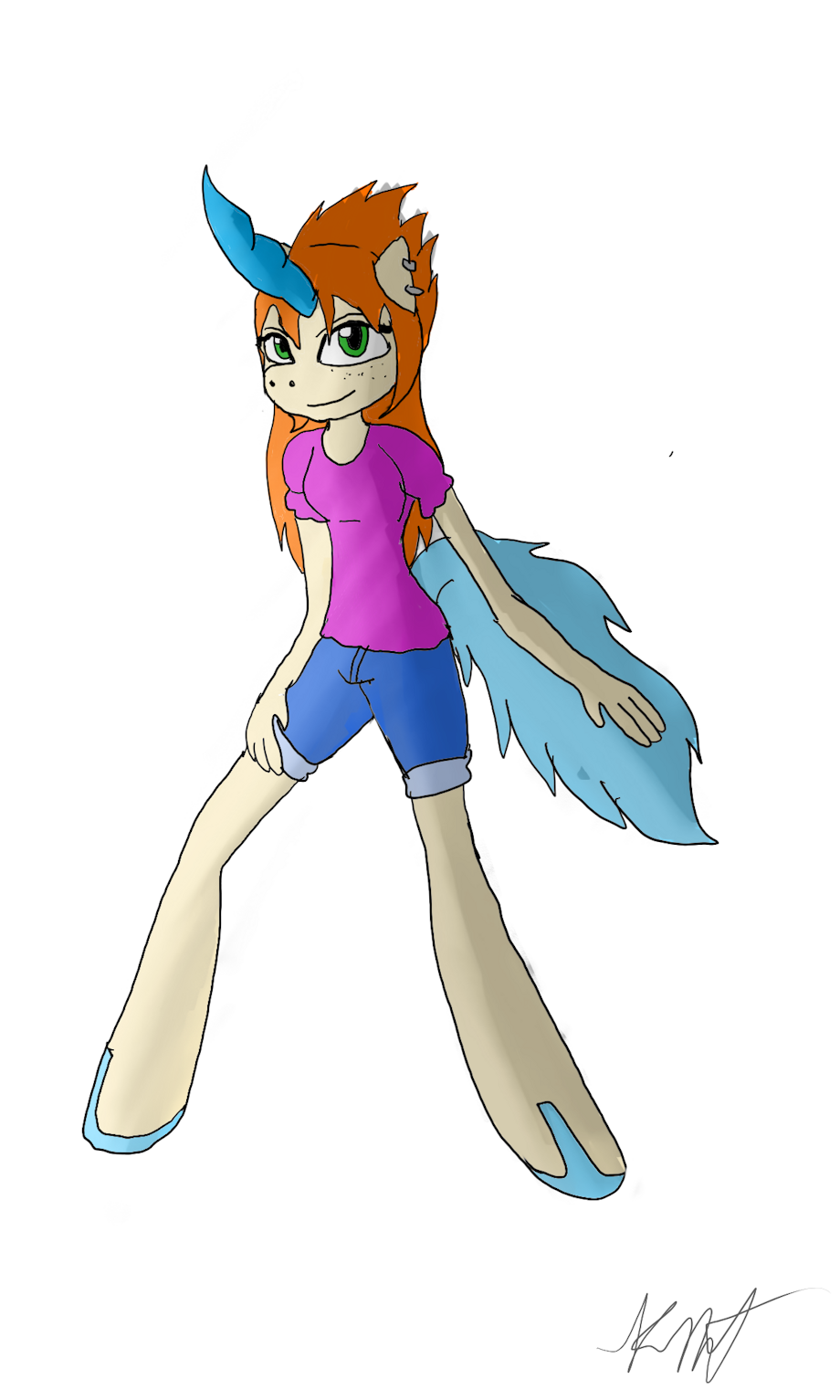 Kelsey is 5'5" and pony-like. She has a long light blue horn resembling a cutlass on her head, cream fur, fiery orange hair that is very unkempt and spiky, but goes to her waist when let down, and fierce green eyes. She has freckles on her cheeks, and her legs go down into hooves with a metallic blue hoof part. Her tail is very fluffy and long, being the same color as her horn and hooves.