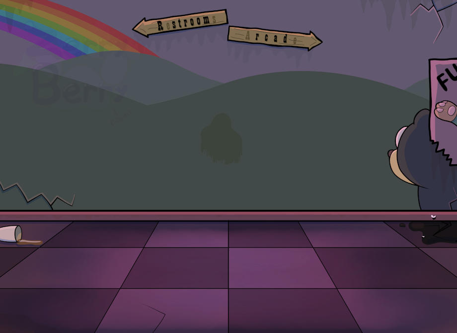 In this case, it is a snippet of a children's pizzeria in this AU called "Banjo Buster's Pizza Playhouse", which was founded in 1965. I wanted to go for a gritty/dystopian look sort of like in the OG show combined with a few hints as to where this pizzeria is located (note the mountains and the black bear on the mural).