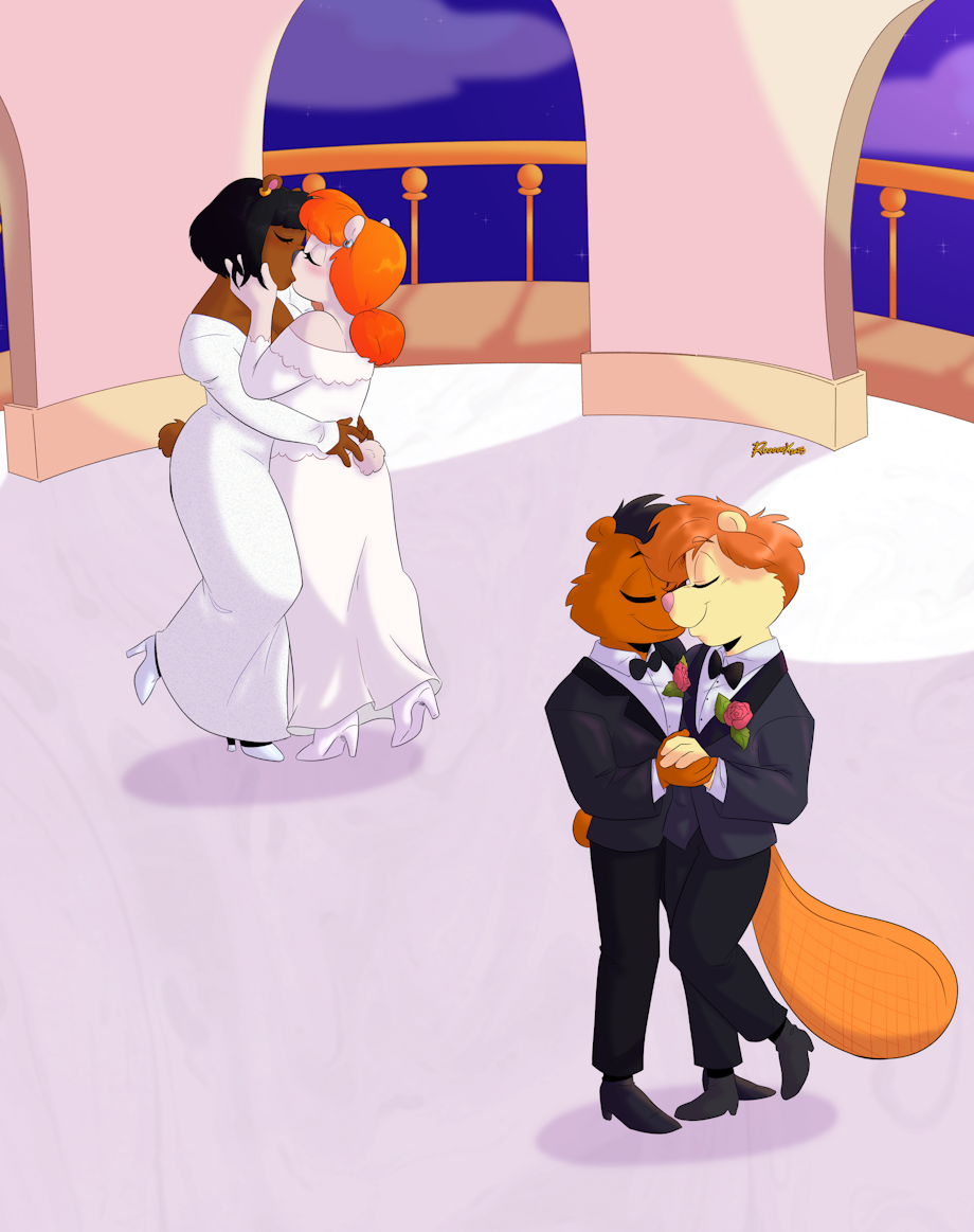 My OCs Jeremy Rivers, his husband Nathan Rivers, Né Nathan Beckett. Along with Nathan's sister, Natalie Clemons Née Natalie Beckett and her wife, Shania Clemons. At their double wedding, mainly Nathan and Natalie's idea.